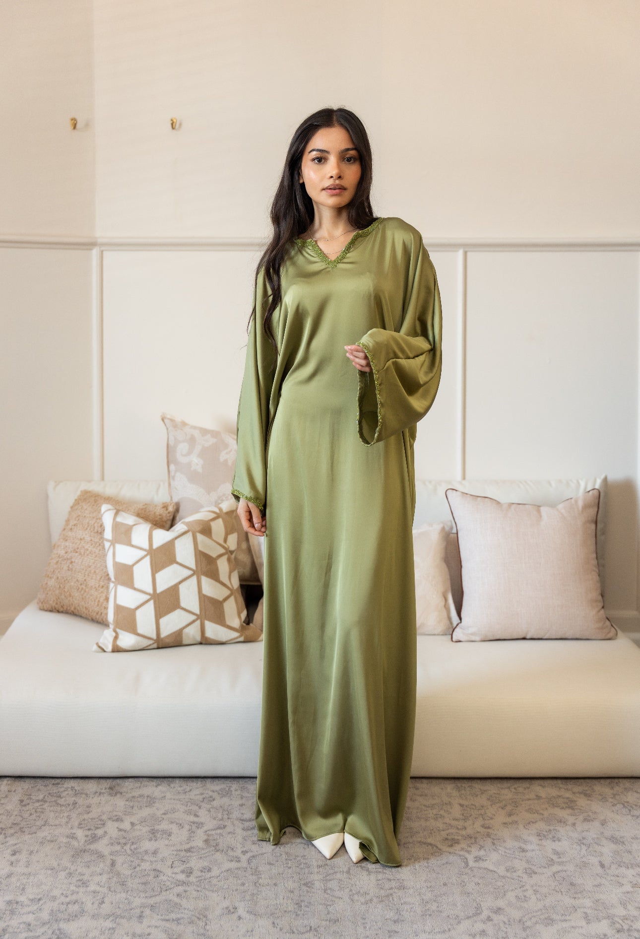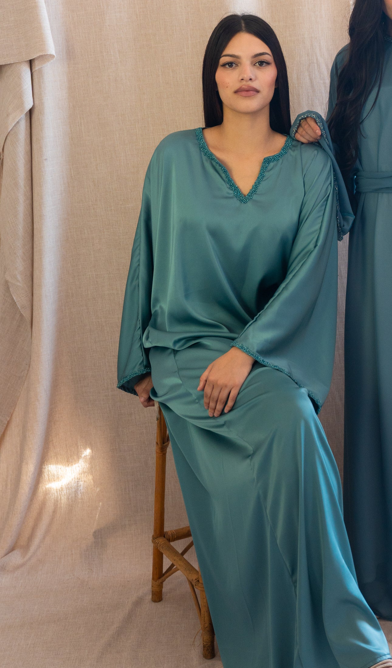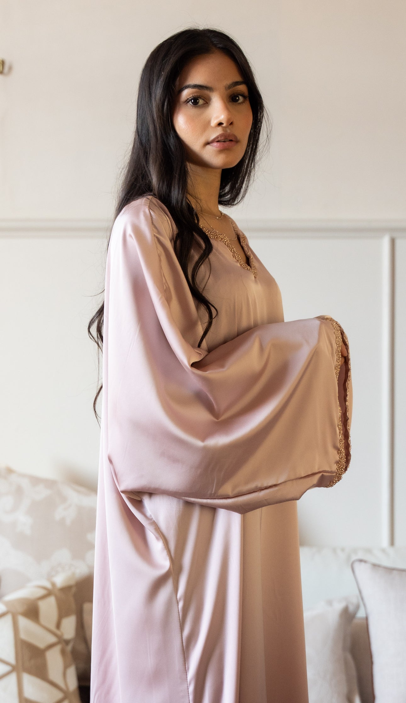 Allow 7-9 days for this beautiful luxe product. A soft light weighted satin finished with a self color bead + tie in belt.