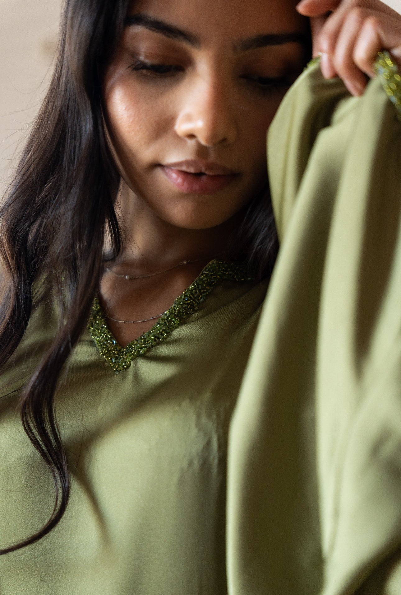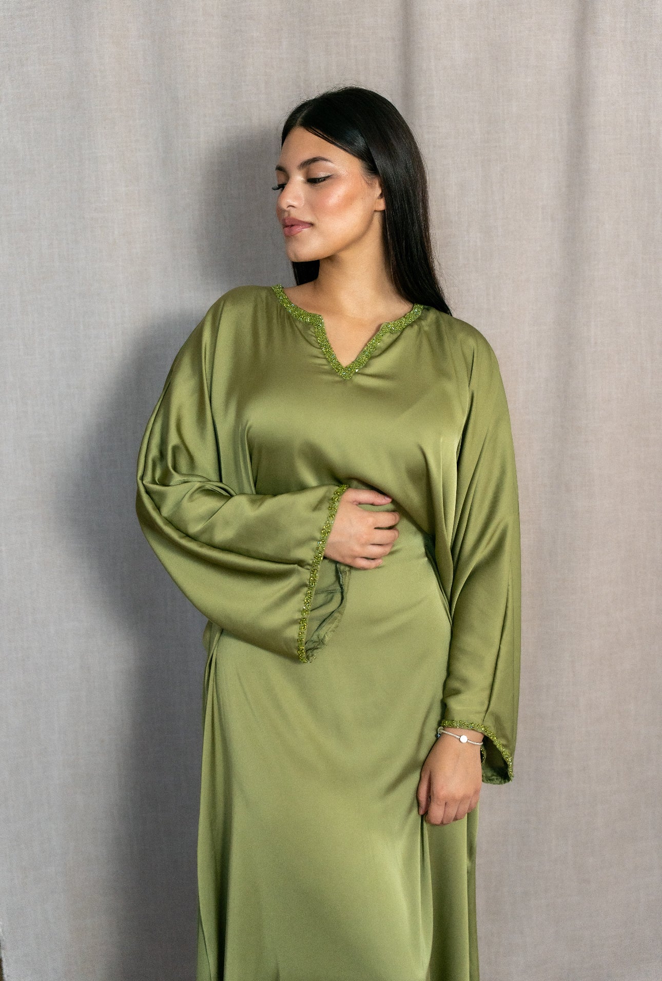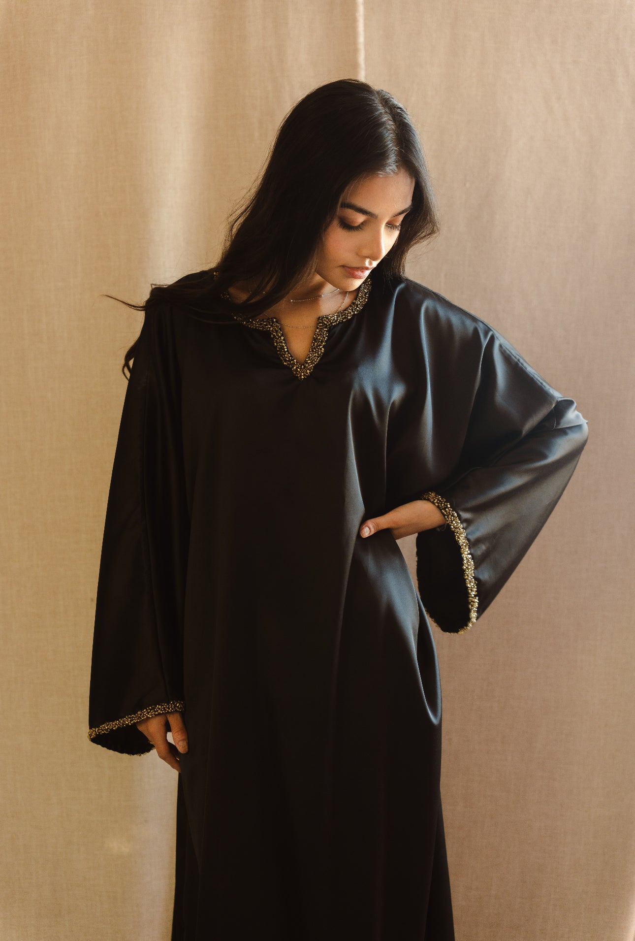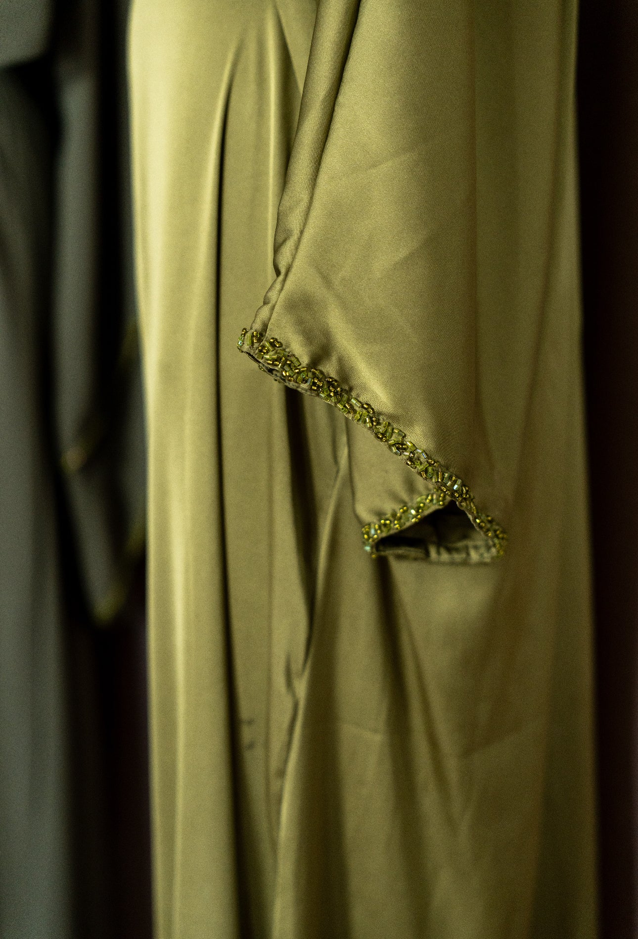 Allow 7-9 days for this beautiful luxe product. A soft light weighted satin finished with a self color bead + tie in belt.