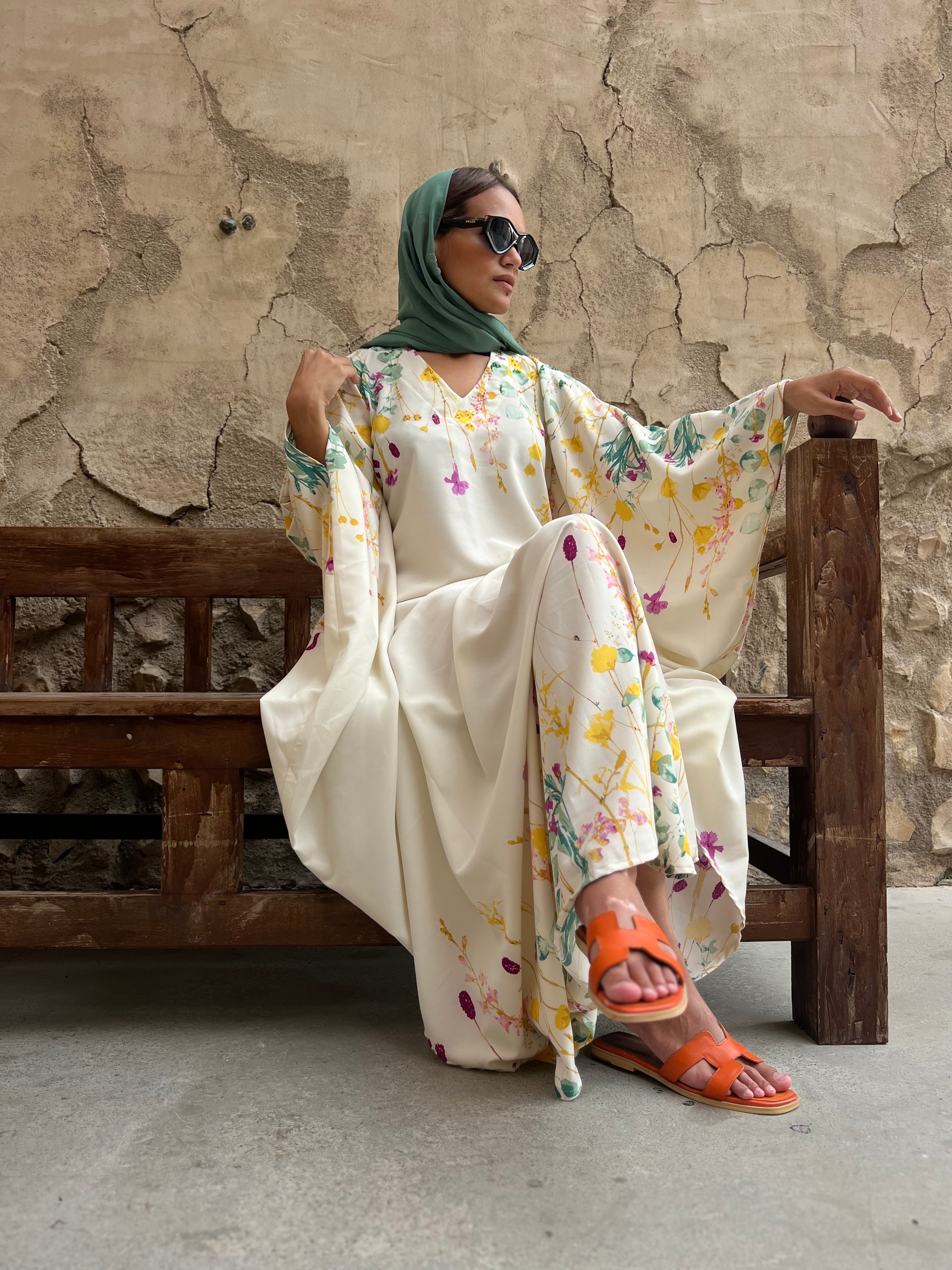 Shop our vanilla cream floral kaftan. Available while stocks last. Please leave your height measurements for this product.
